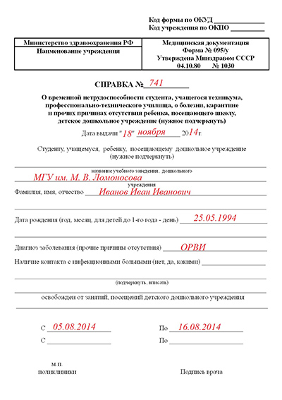 Медицинская справка № 095/у – официальный документ, выдаваемый в лечебно-профилактических учреждениях и подтверждающей временную нетрудоспособность предъявителя. Ее получение необходимо студентам, школьникам и дошкольникам в качестве подтверждения болезни, не позволяющей посещать учебные занятия. Документ выдается на срок не более 14 дней. При необходимости продления на срок не более 30 дней его снабжают дополнением по форме 027/у (выпиской о состоянии здоровья пациента).